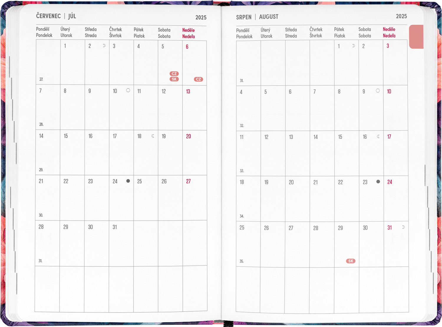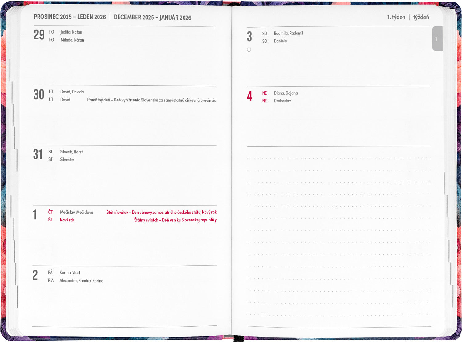 Osemnásťmesačný diár obsahuje prehľad na rok 2025 a 2026, zoznam českých a slovenských mien, česko-slovenské týždenné riadkové kalendárium s menami a sviatkami a priestor na poznámky. Kalendárium začína v júli 2025 a končí v decembri 2026.