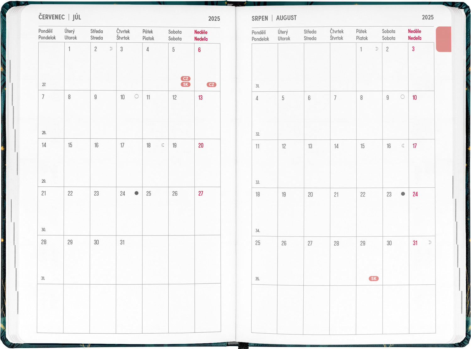 Osemnásťmesačný diár obsahuje prehľad na rok 2025 a 2026, zoznam českých a slovenských mien, česko-slovenské týždenné riadkové kalendárium s menami a sviatkami a priestor na poznámky. Kalendárium začína v júli 2025 a končí v decembri 2026.