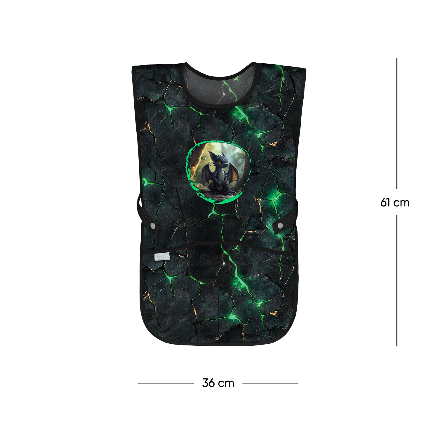 Štýlová zástera s motívom roztomilého dráčika, vhodná na výtvarnú výchovu, pracovné činnosti a rôzne krúžky.
