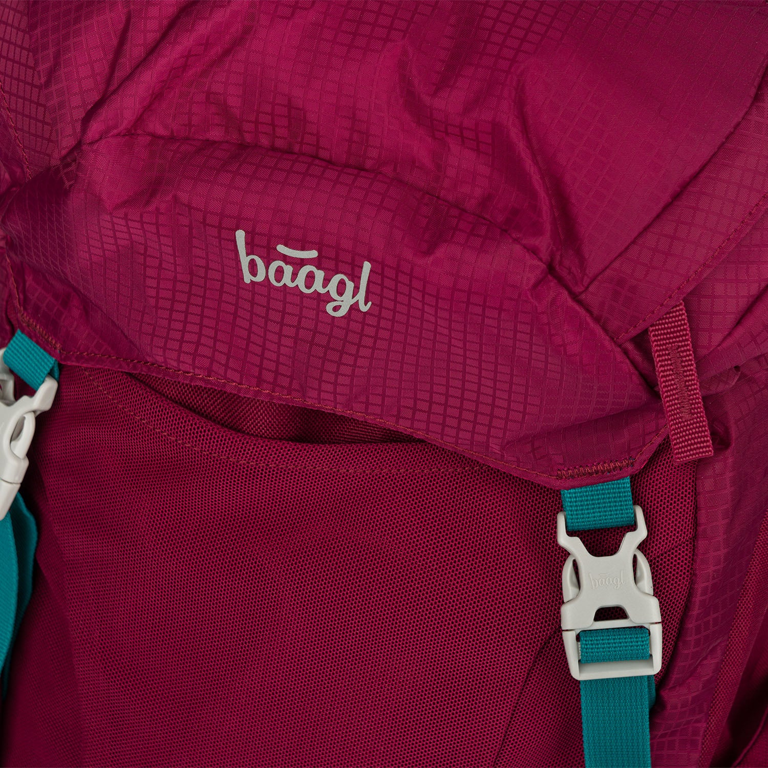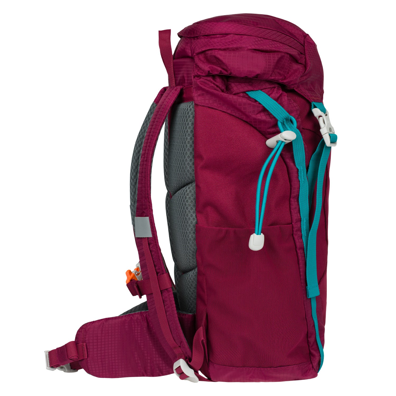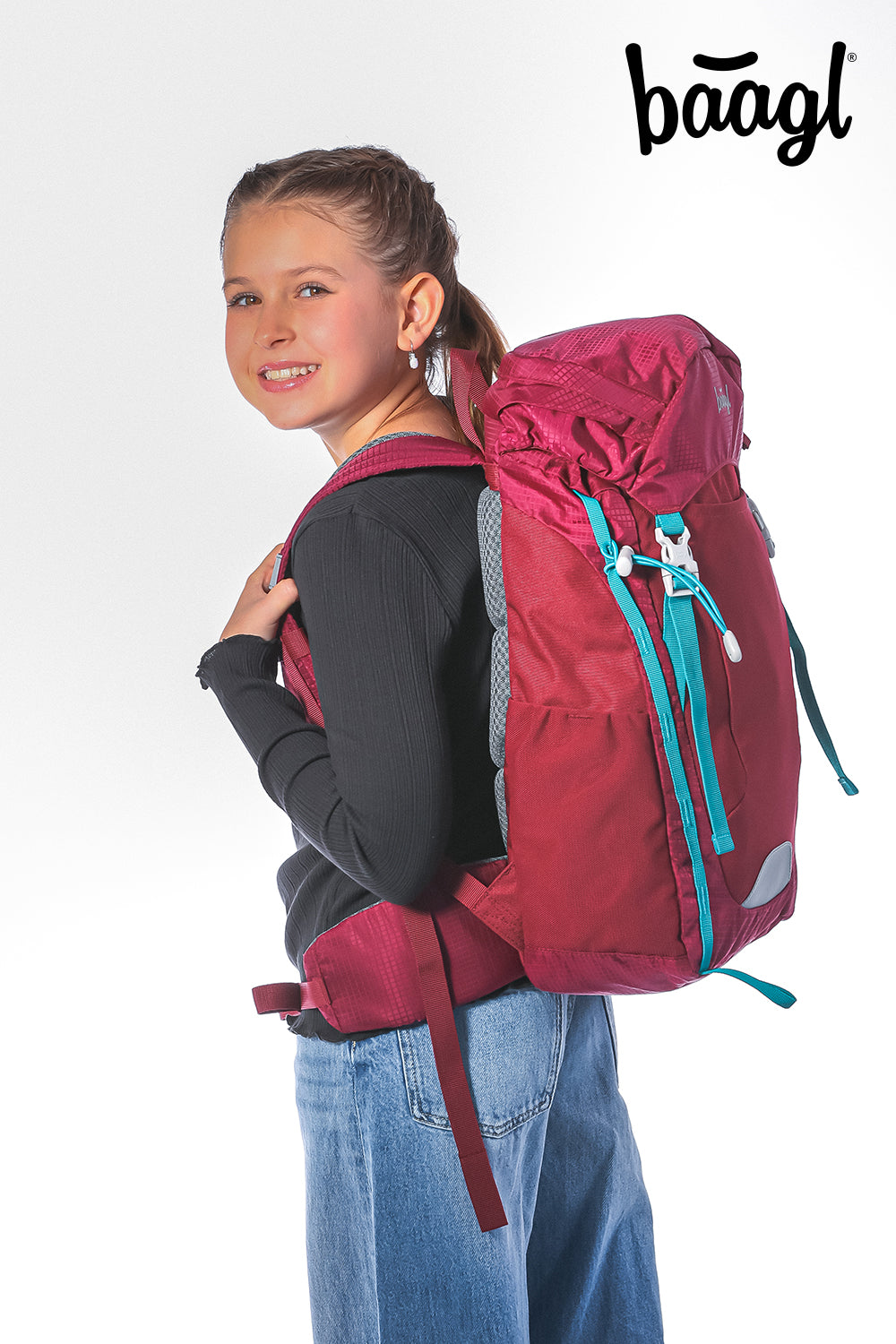 Vínový outdoorový batoh Tracker s tyrkysovými popruhmi a polstrovaným chrbtom s vetraním je vhodný pre deti od 3. triedy.