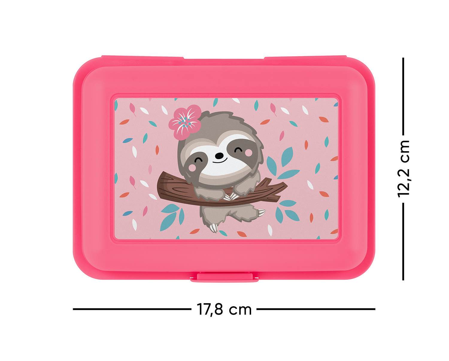 Fialový box na svačinu s obrázkem roztomilého lenochoda.