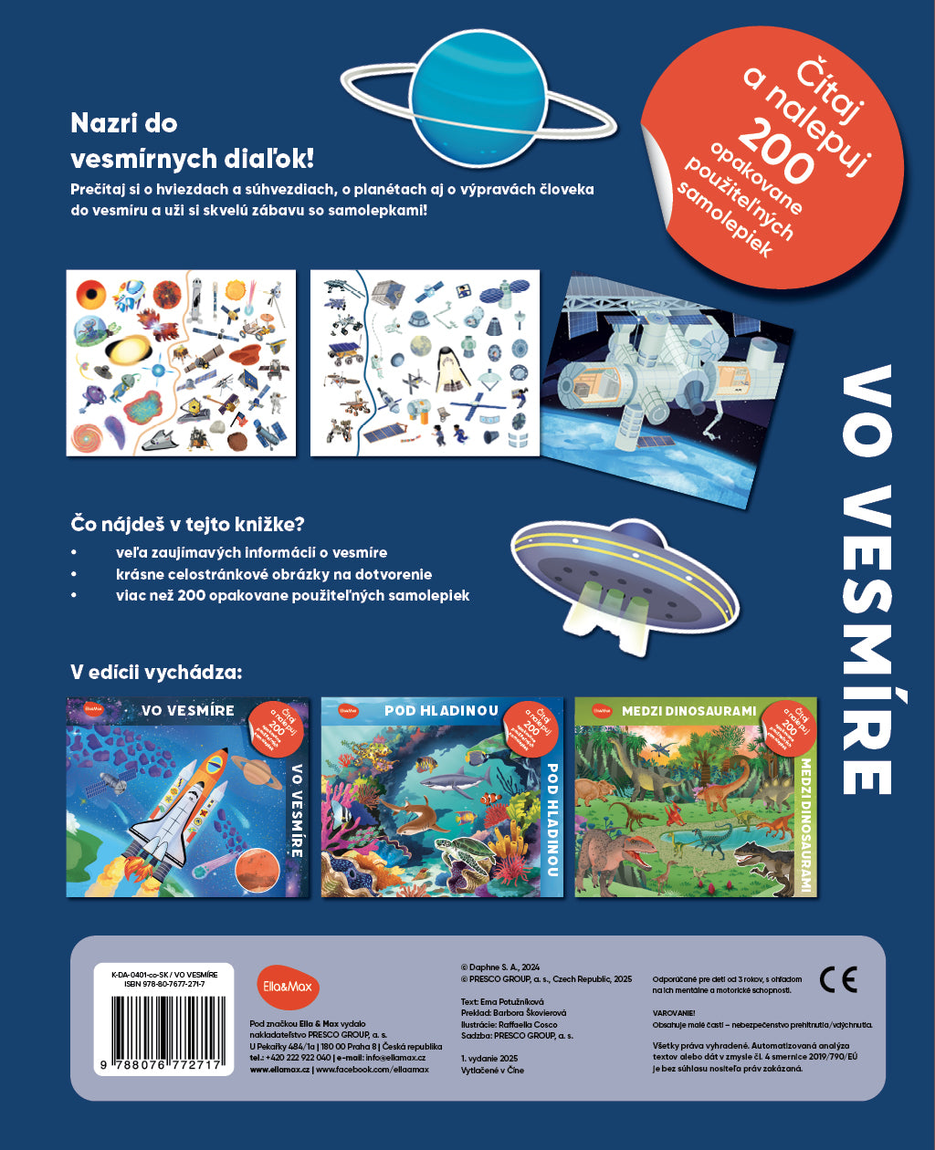 Užijte si spoustu zábavy s úžasnými adhezivními samolepkami, díky nimž stvoříte svůj vlastní vesmír! V téhle knížce jich objevíte více než dvě stovky a můžete s jejich pomocí donekonečna dotvářet překrásné celostránkové obrázky, k nimž samolepky jednoduše přilnou. Vedle toho tu najdete také poutavý text plný zajímavých informací o vesmíru. Zavítáte do světa vesmírných dálek, přečtete si o hvězdách a souhvězdích, o planetách i o výpravách člověka do kosmu.