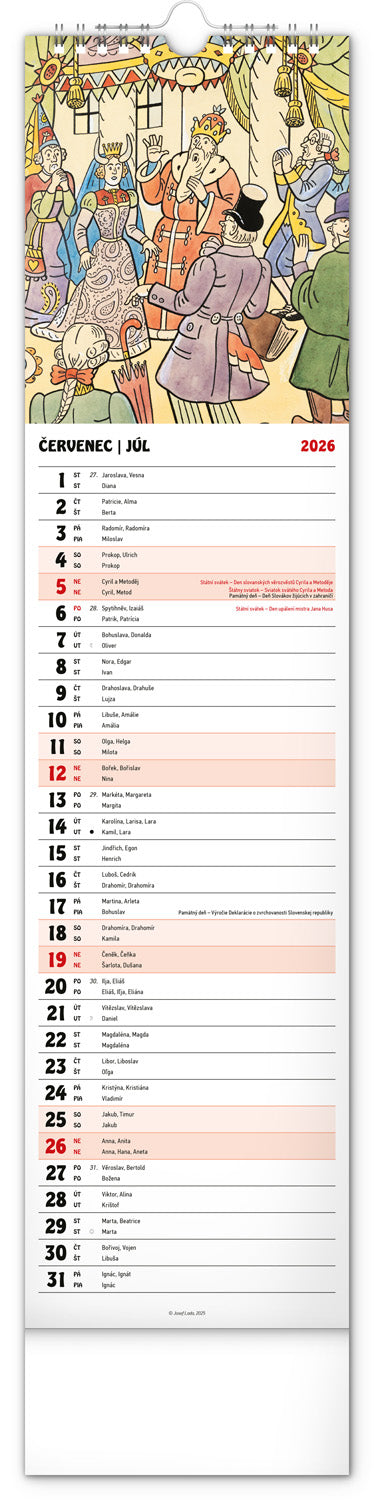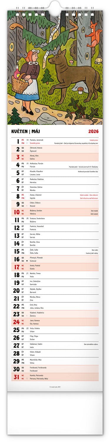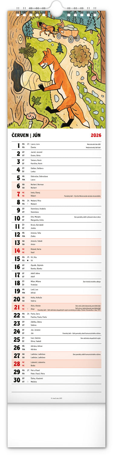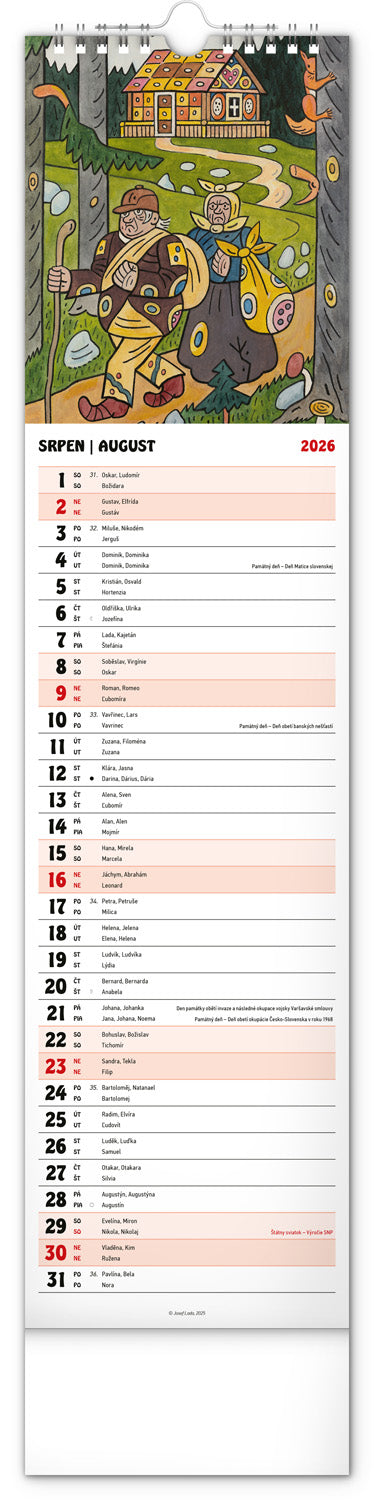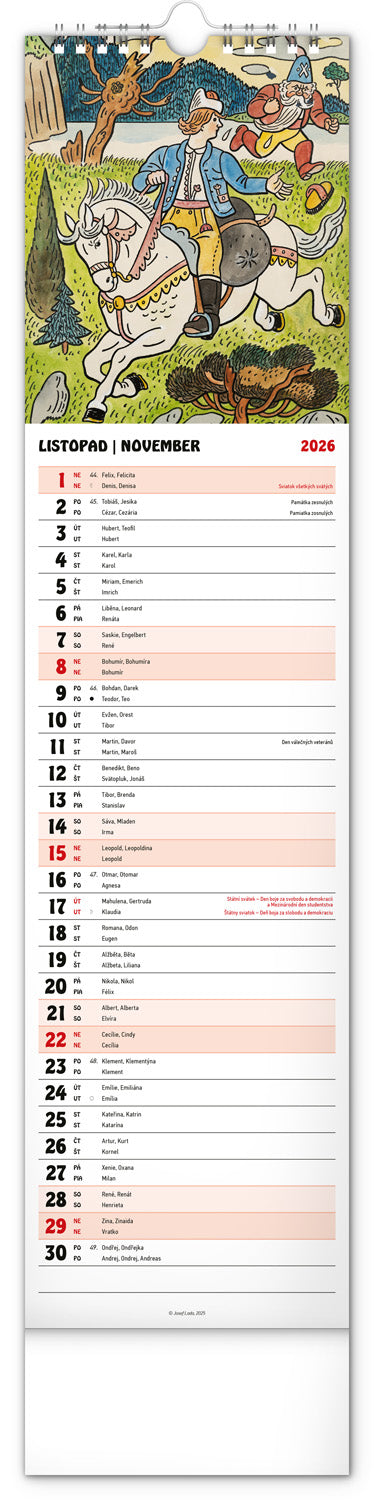 Nástenný kalendár s ilustráciami Jozefa Lady a jeho rozprávkovými motívmi je vyhotovený v obľúbenom úzkom formáte, ktorý osvieži každý interiér. V kalendári je rovnocenne zahrnutá čeština a slovenčina, ilustrácie dopĺňajú české a slovenské mená, sviatky, pamätné dni a mesačné fázy. Každý deň má priestor na poznámky, víkendové dni sú farebne odlíšené od pracovných.