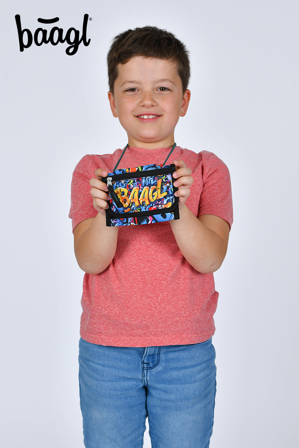 Praktická peňaženka s motívom skateparku a šnúrkou s bezpečnostnou poistkou na pohodlné a bezpečné nosenie na krku.
