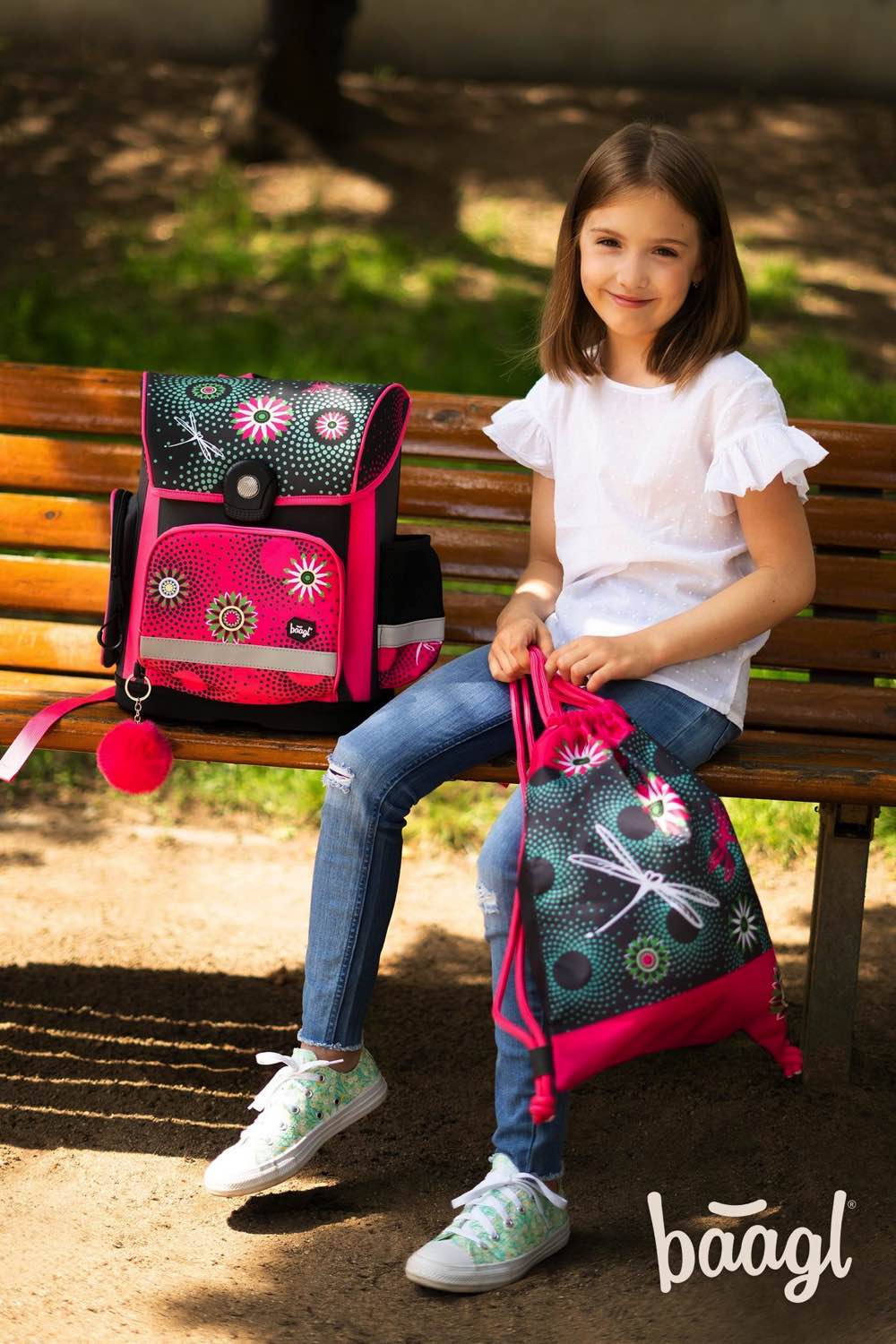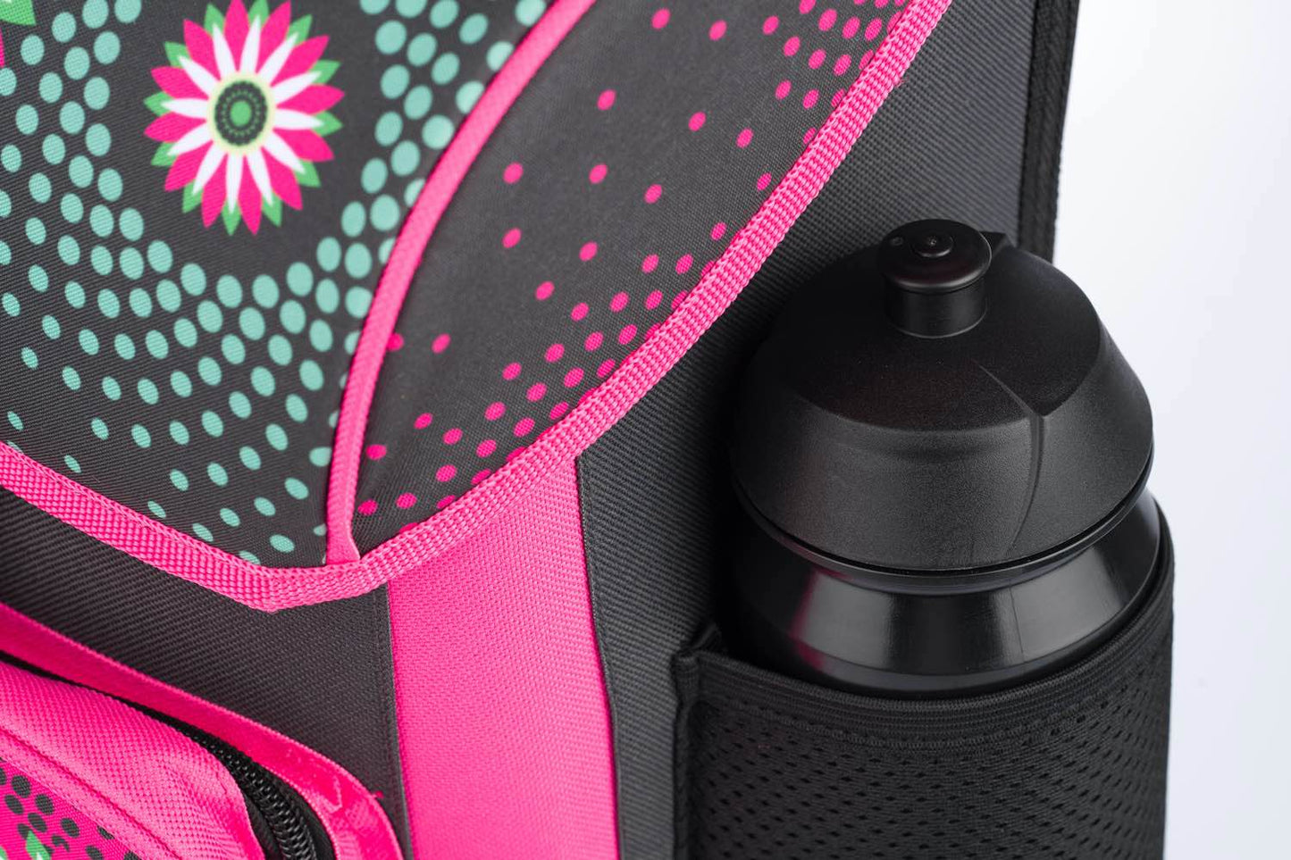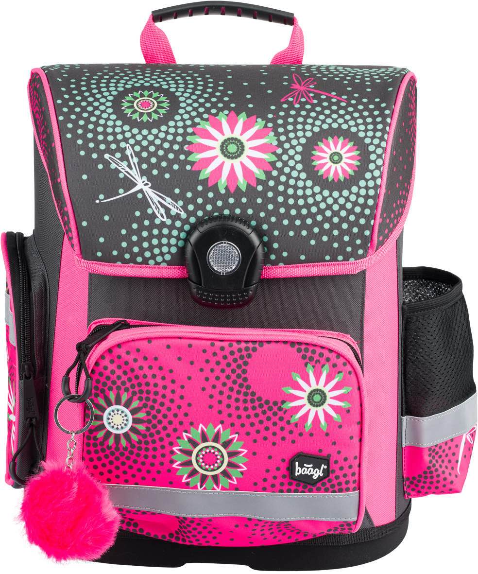 Zelená školská aktovka s výraznými ružovými akcentami kvetov. Táto školská aktovka je vhodná pre 1.–2. triedu ZŠ.