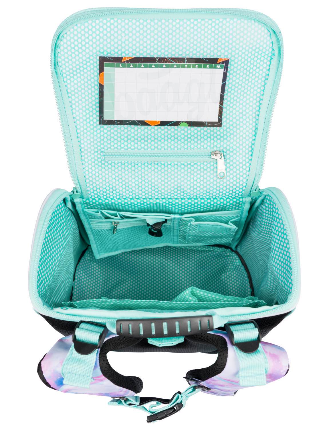 • Vnútri aktovky je priehľadná kapsa s rozvrhom a vnútorný organizér umožňujúci rovnomerné rozloženie hmotnosti doplnený gumičkou kvôli fixácii.