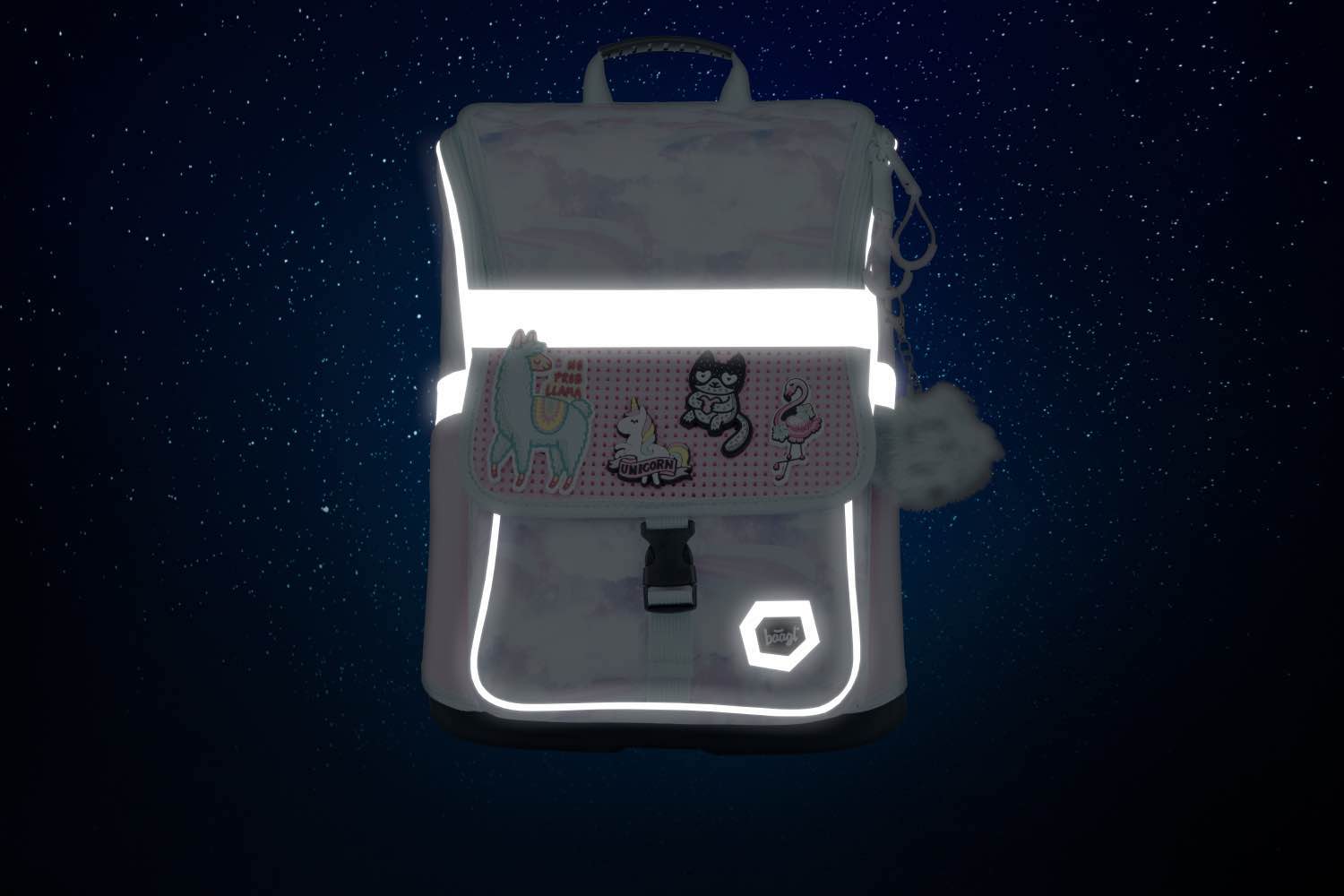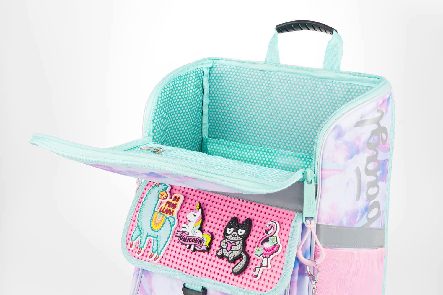 •Aktovka disponuje novým vyklápacím systémom otvárania na zips, vďaka ktorému sa školák ľahšie dostane k svojim pomôckam priamo z lavice a umožňuje lepší prehľad o obsahu školskej tašky.