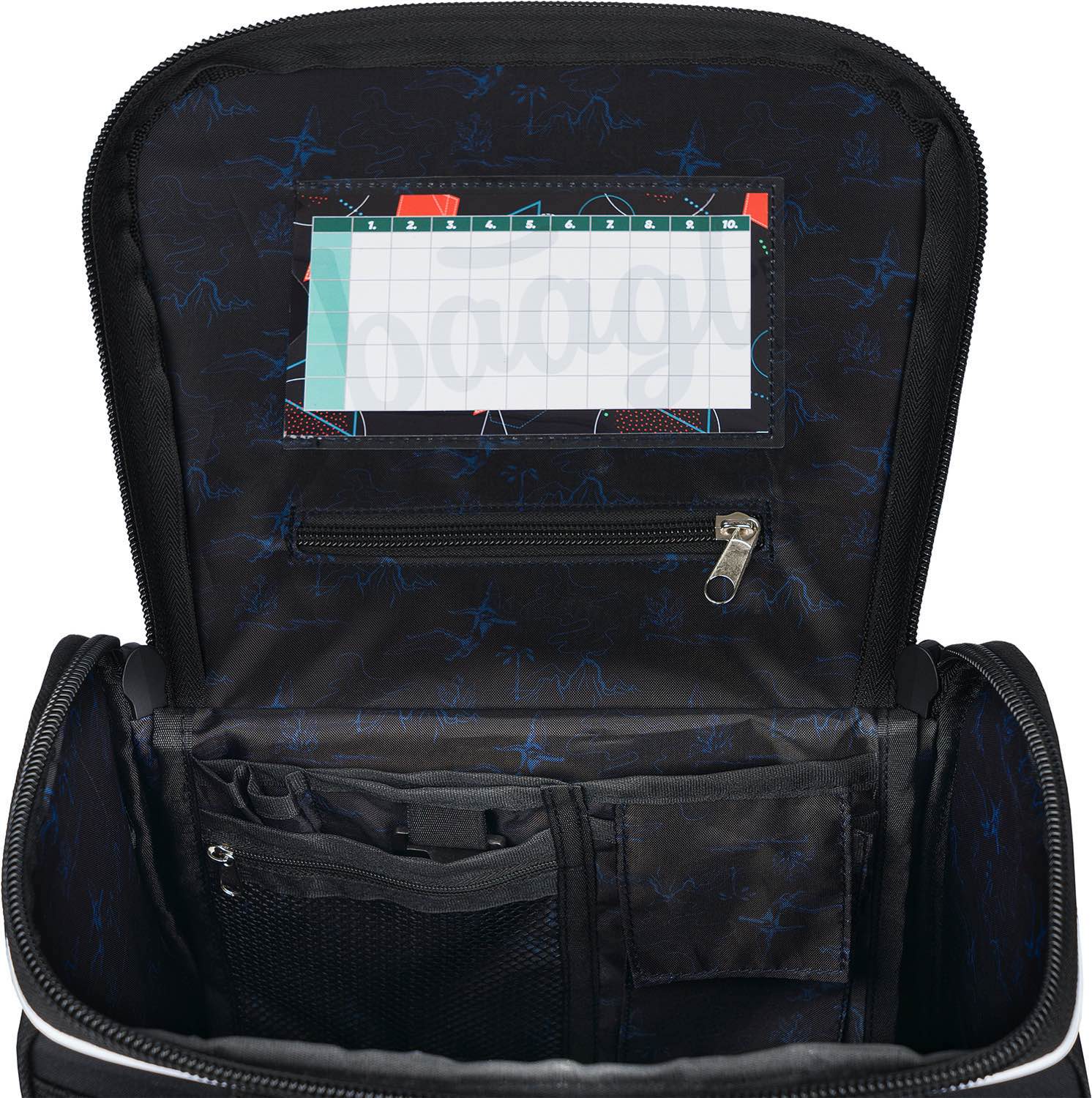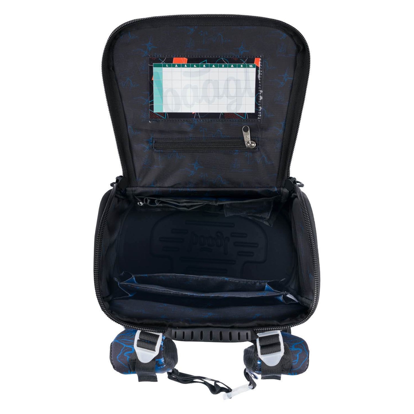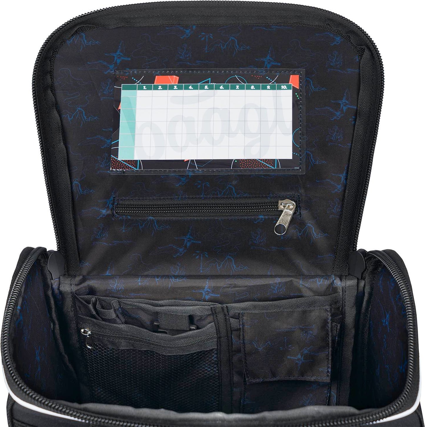• Vnútri aktovky je priehľadná kapsa s rozvrhom a vnútorný organizér umožňujúci rovnomerné rozloženie hmotnosti doplnený gumičkou kvôli fixácii.