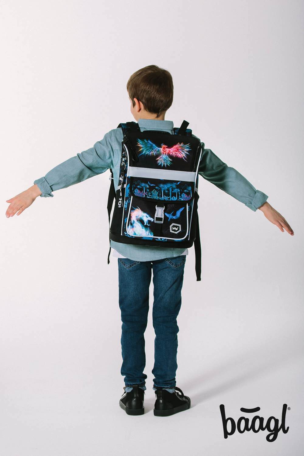 Čierna aktovka Zippy Fénix s potlačou bájneho Fénixa, vhodná pre 1. a 2. triedu základnej školy.