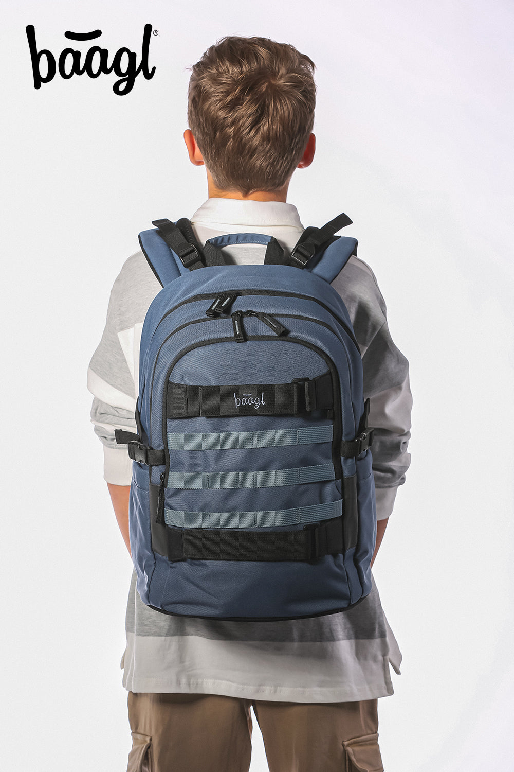 Cenovo výhodná školská súprava obsahujúca ergonomický batoh Skate Dust Blue s popruhmi na skateboard, študentský peračník a praktickú športovú tašku Hoop je nevyhnutnou školskou výbavou.