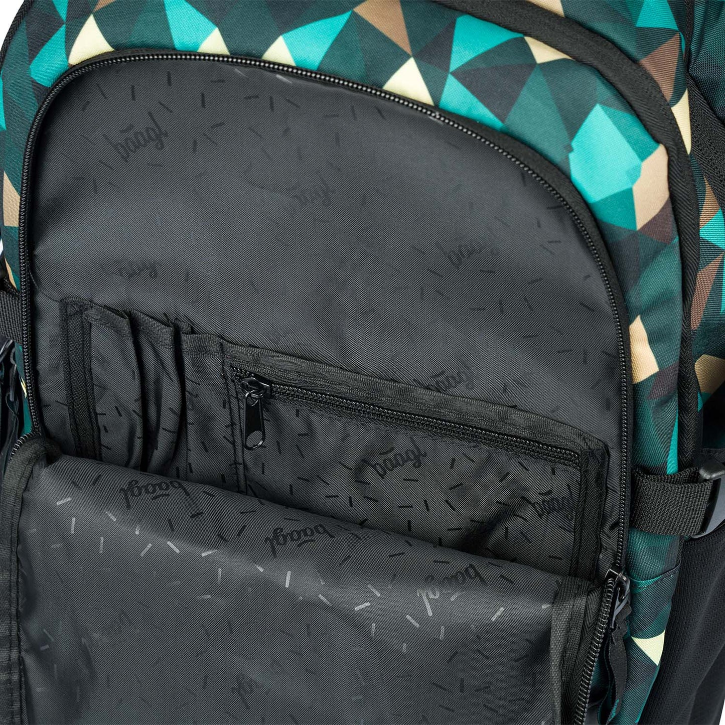 Výrazne zelený batoh Skate Polygón s popruhmi na umiestnenie skateboardu a so zlatým logom BAAGL na prednej strane. Tento batoh je vhodný už od 3. triedy ZŠ.