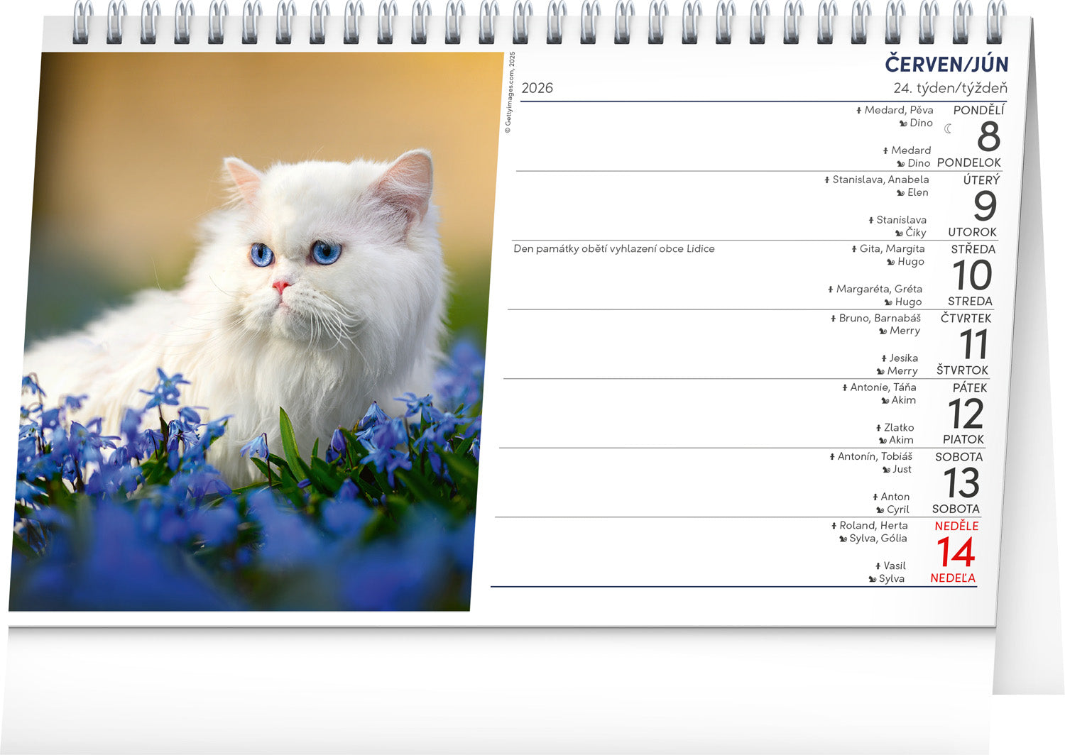 Dvojjazyčný stolný kalendár s fotkami a menami mačiek s praktickým týždenným kalendáriom.