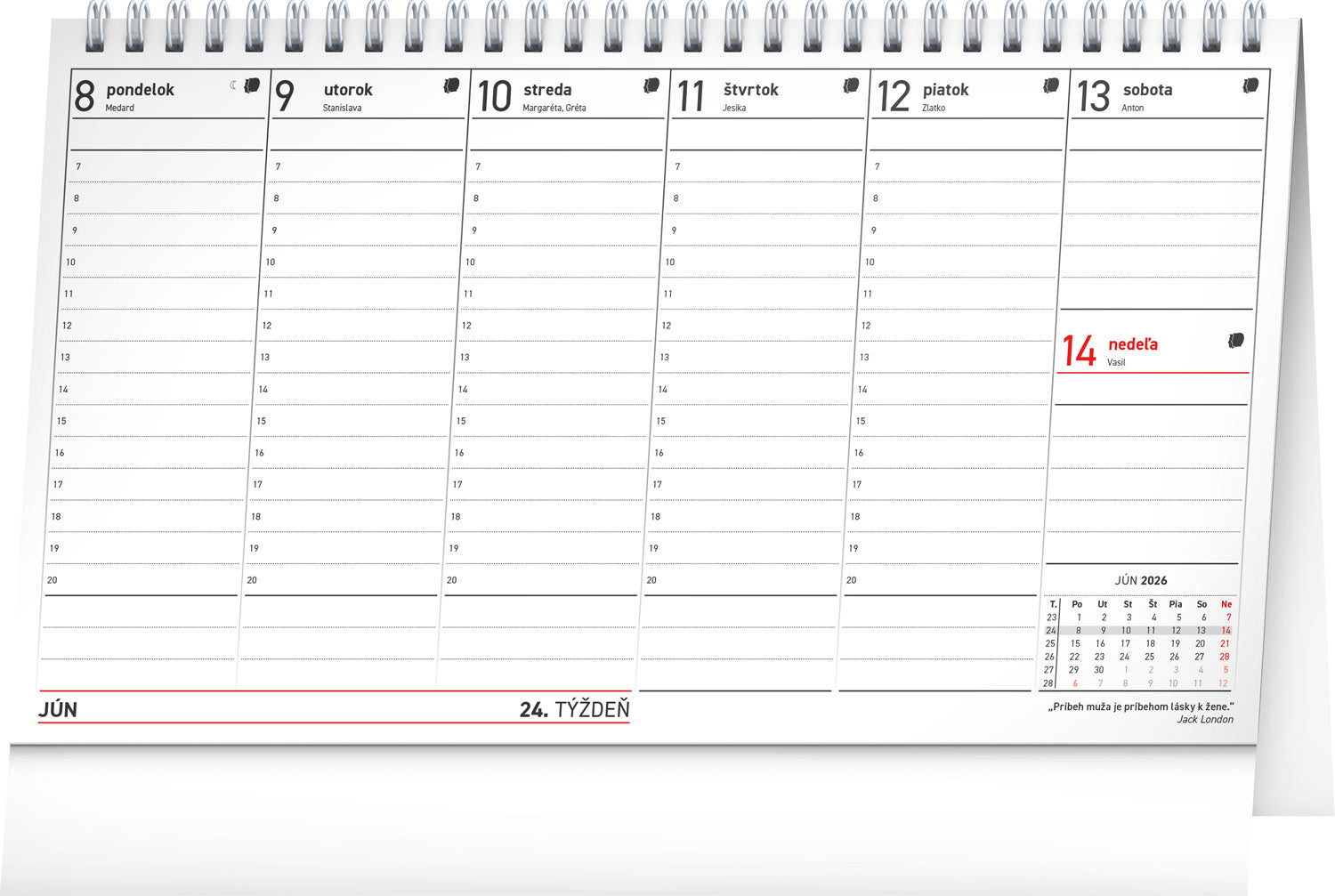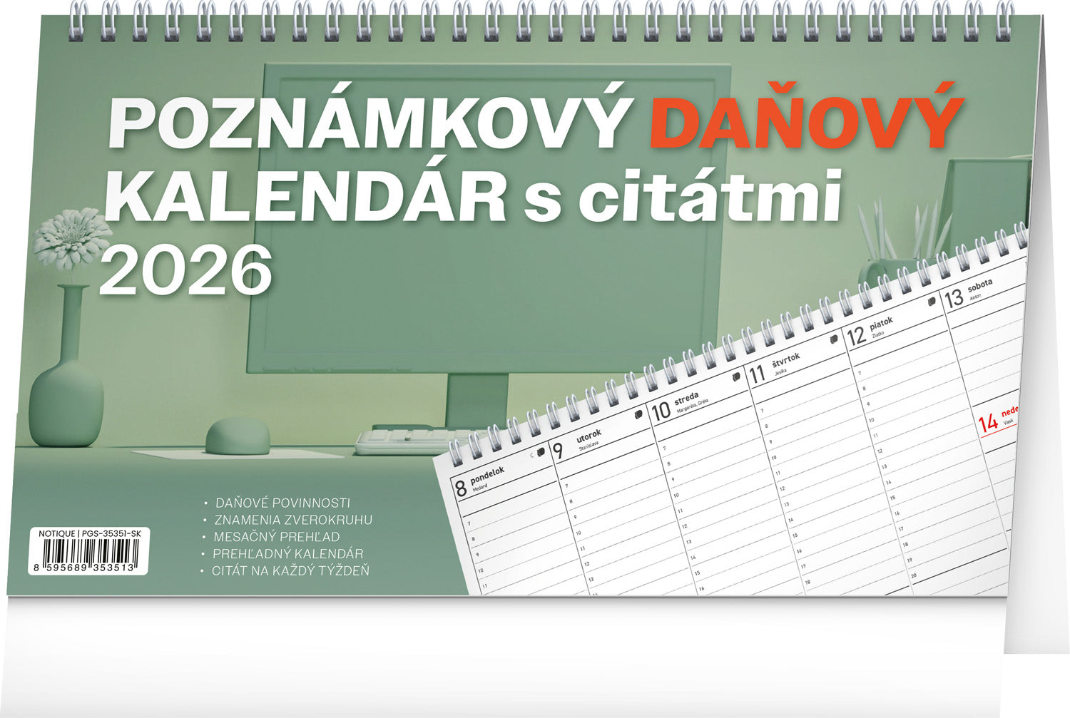 Prehľadný daňový kalendár, vďaka ktorému nezabudnete na žiadnu daňovú povinnosť, a navyše sa zoznámite s množstvom zaujímavých citátov slávnych osobností. Stĺpcové kalendárium obsahuje mesačný prehľad v každom týždni, znamení zverokruhu, slovenské mená, sviatky a pamätné dni.