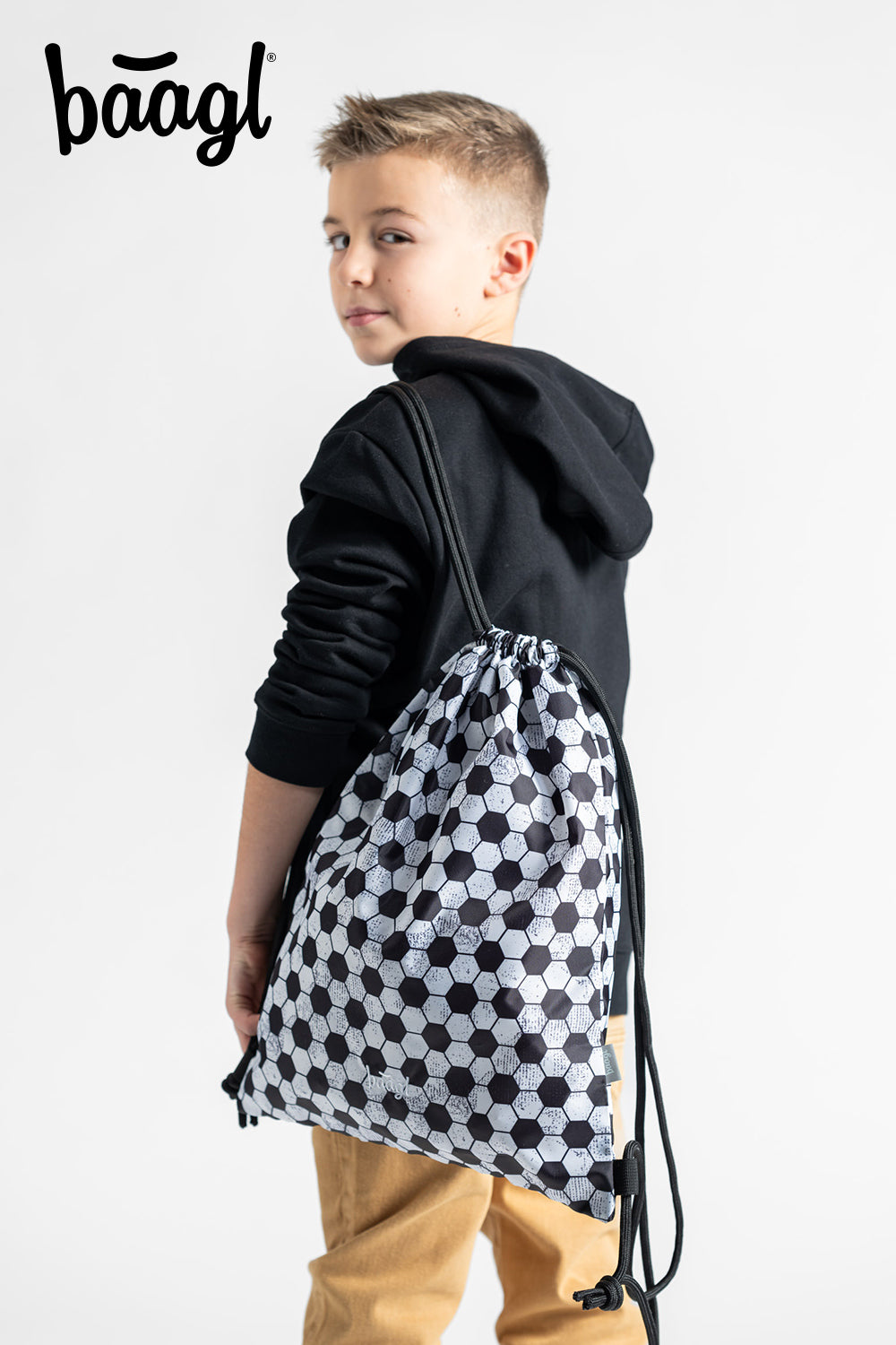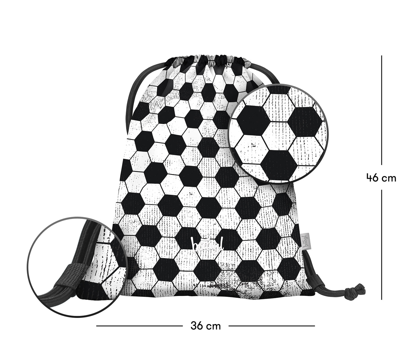 Praktické vrecko na obuv alebo telocvik s futbalovým motívom. Vyrobené z recyklovaného materiálu.