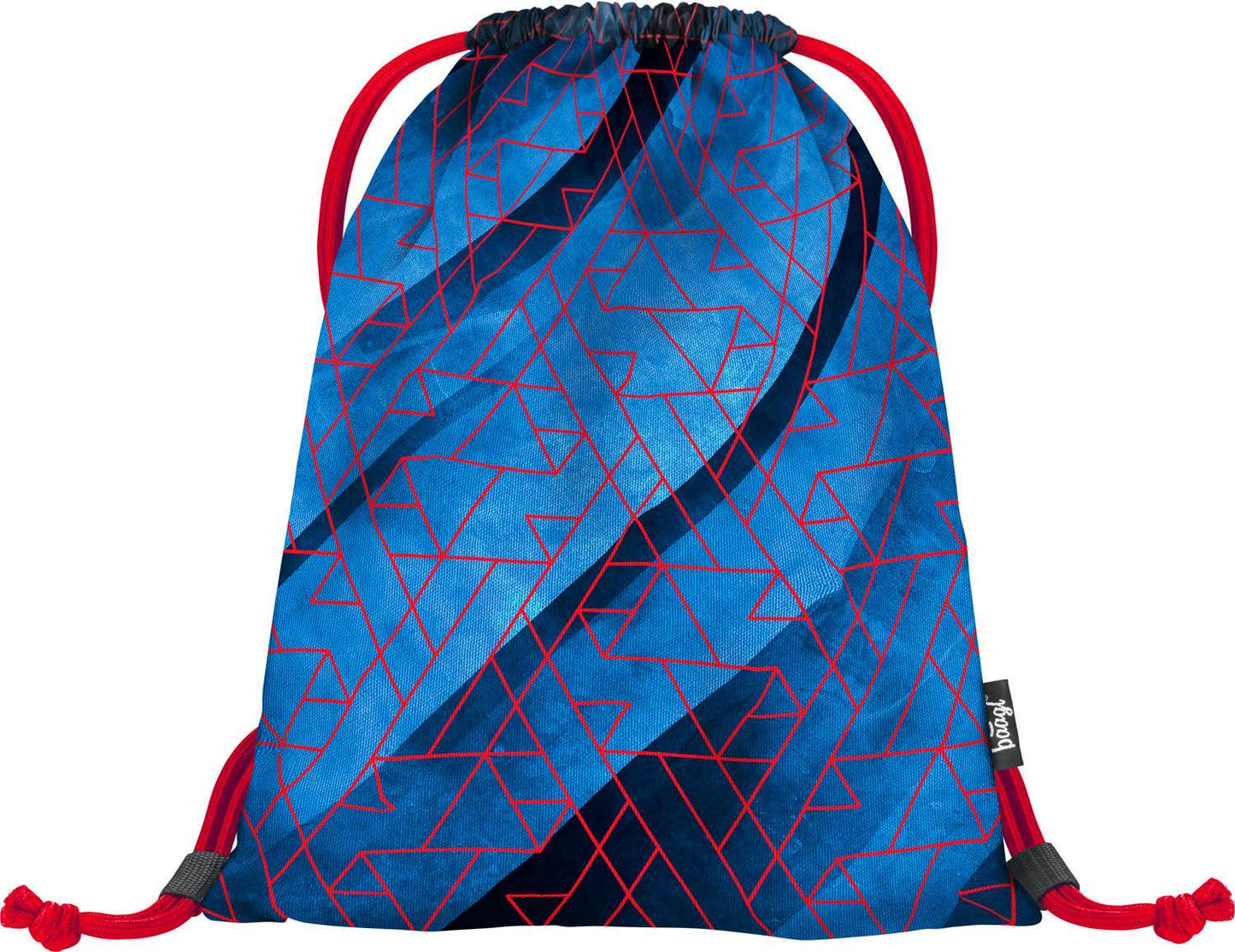 Modré vrecko na obuv s červenými detailmi a šnúrkami na nosenie na chrbte.