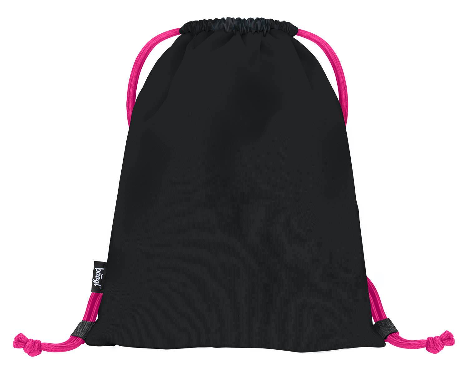 Čierne vrecko na cvičky alebo prezuvky s obrázkom tenisiek a s ružovou kapsou v prednej časti.