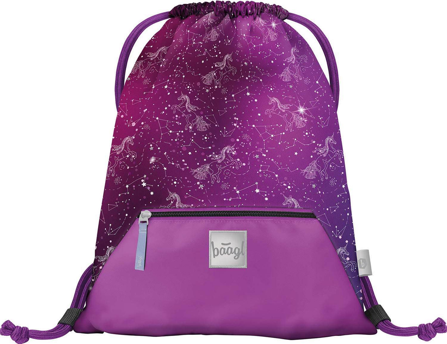 Dievčenské vrecko na papuče alebo na telocvik Jednorožec je vyrobené z pevného vodovzdorného materiálu. Má zosilnené šnúry na pohodlné nosenie na chrbte a praktickú kapsičku na zips.